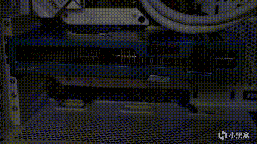 背面存在少量機甲科幻絲印元素,剋制的設計保留了現實,不可否認的是,這種金屬感恰到好處,加上一體化設計看起來就是賞心悅目,此外目前不少非公顯卡背面都有貫穿式通風設計,GUNNIR Arc A750 FLUX採用一種百葉窗式,足夠獨特和鮮活,相比正面,背面整體似乎更搶眼球。