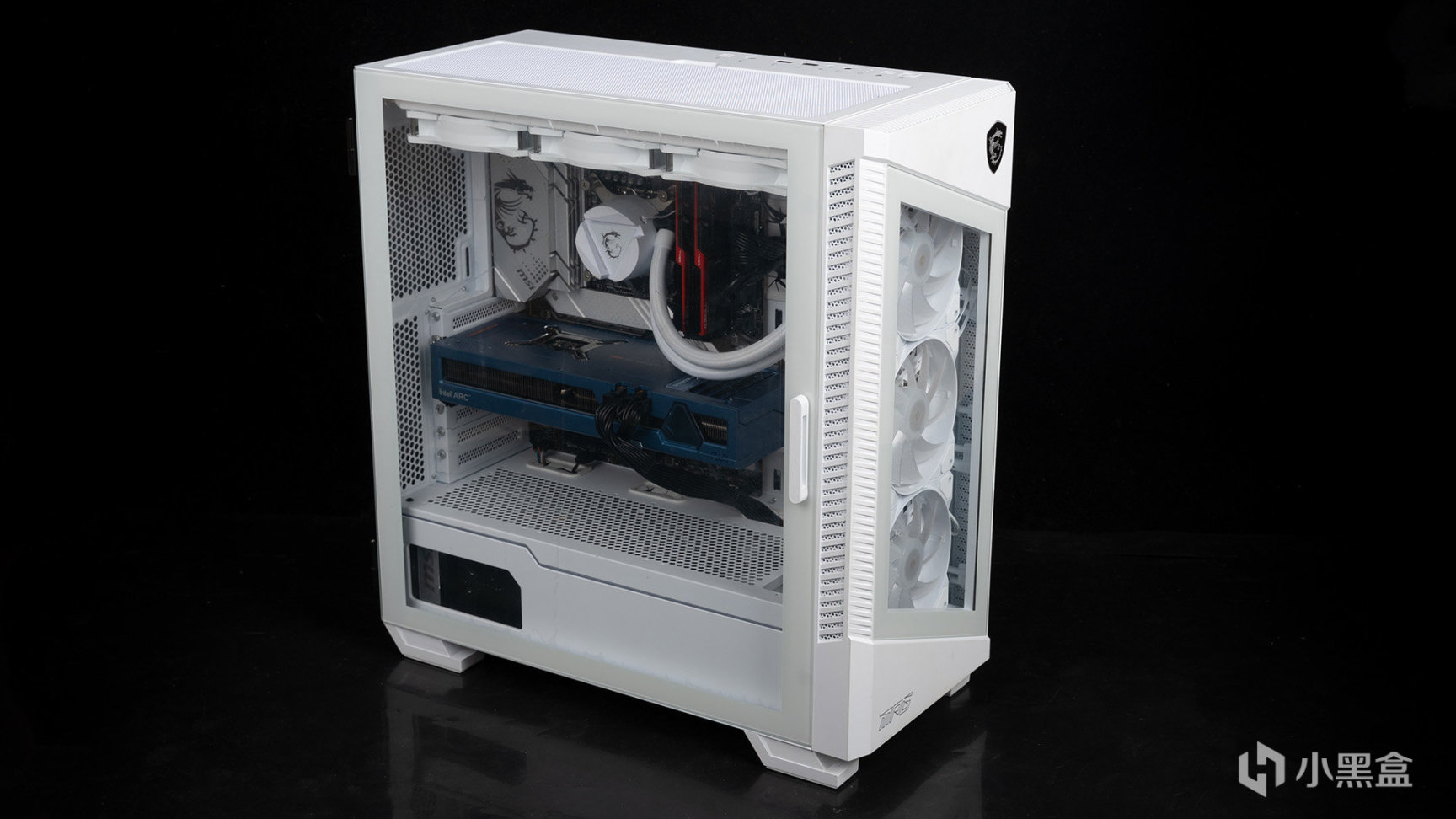 機箱: 使用的是微星MPG VELOX 刀鋒100R白色款,前部預裝三枚120mm ARGB風扇,沒有安裝後置風扇,側面是主流的鋼化玻璃側板,理論上箱內熱量積聚會更多一些,對顯卡散熱是一種更強的考驗