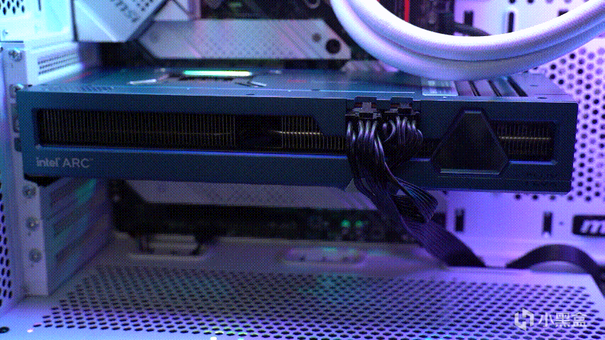 肩部燈控芯片,LED位置區域呈GUNNIR LOGO狀,不僅是充當信仰燈,而且可以監測電源和主板,並且橫向的燈光條,燈光會隨顯卡的負載(溫度)的變化而流動變化,這在整個行業顯卡產品中似乎都是很少見的,相對來說剋制又靈動。配備雙8pin顯卡供電接口,內置8+4相供電,對於300W TBP功耗的Arc A750來說卓卓有餘,用料比公版也更強。