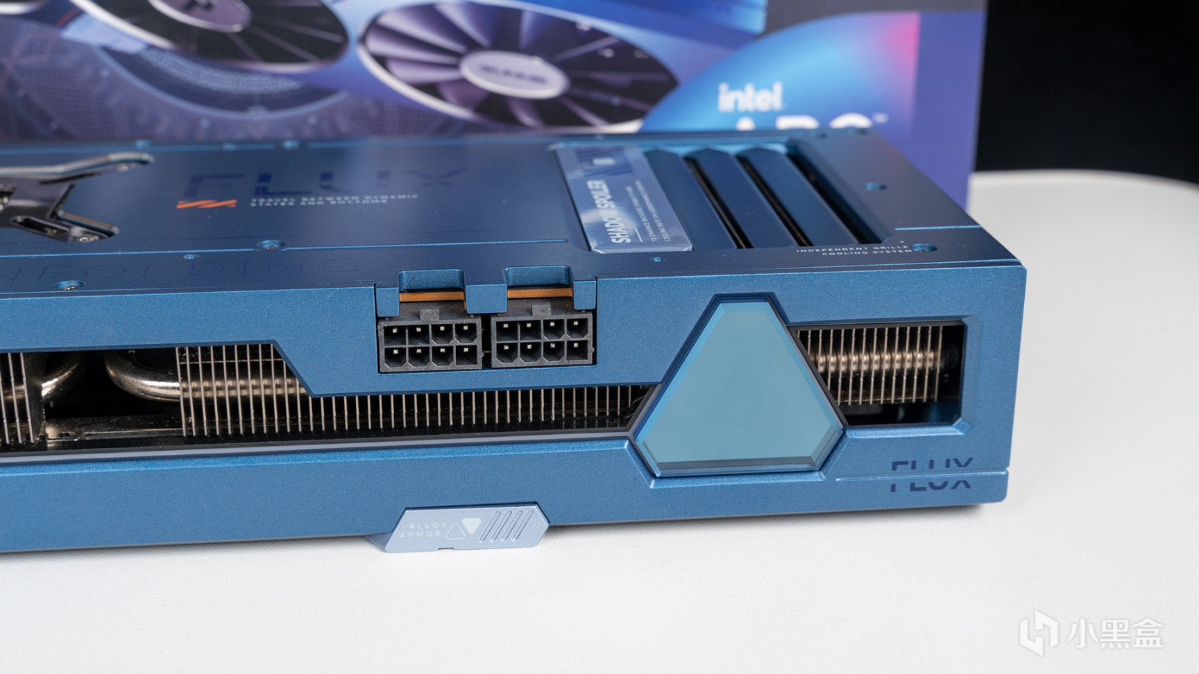 側面肩部屬於比較方的輪廓,呼應顯卡整體造型和線條,左、右側分別有intel ARC和FLUX系列的簡潔文字標識。