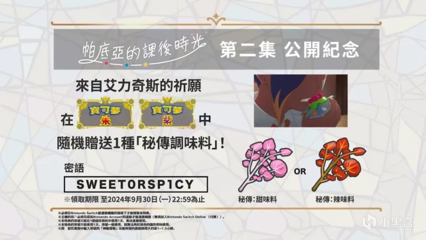 《宝可梦朱紫》衍生网络动画《帕底亚的课后时光》第2集“屏息”现已播出,和上集一样,本次也有播出配信可以领取,是1份随机秘传调料。