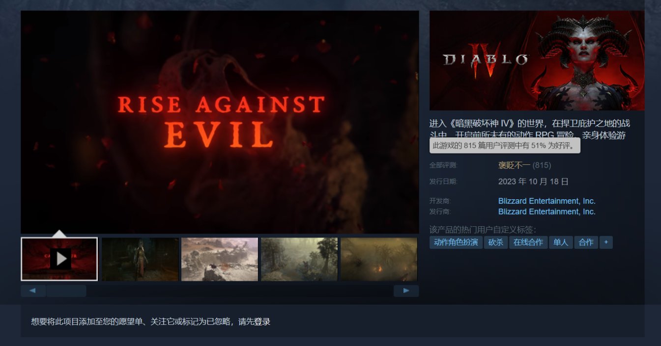 - 《暗黑破坏神 4》于今日正式登录 Steam 平台,本作现在Steam平台累计收到收到815条玩家评论,好评率为 51%,整体为“褒贬不一”,首日Steam玩家同时在线峰值仅为5402人。