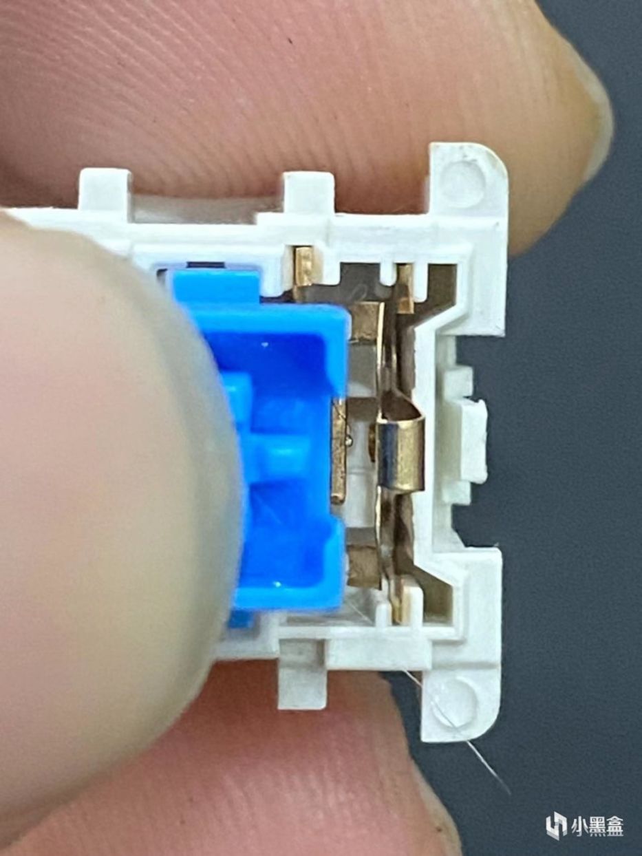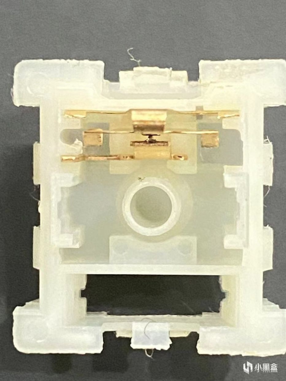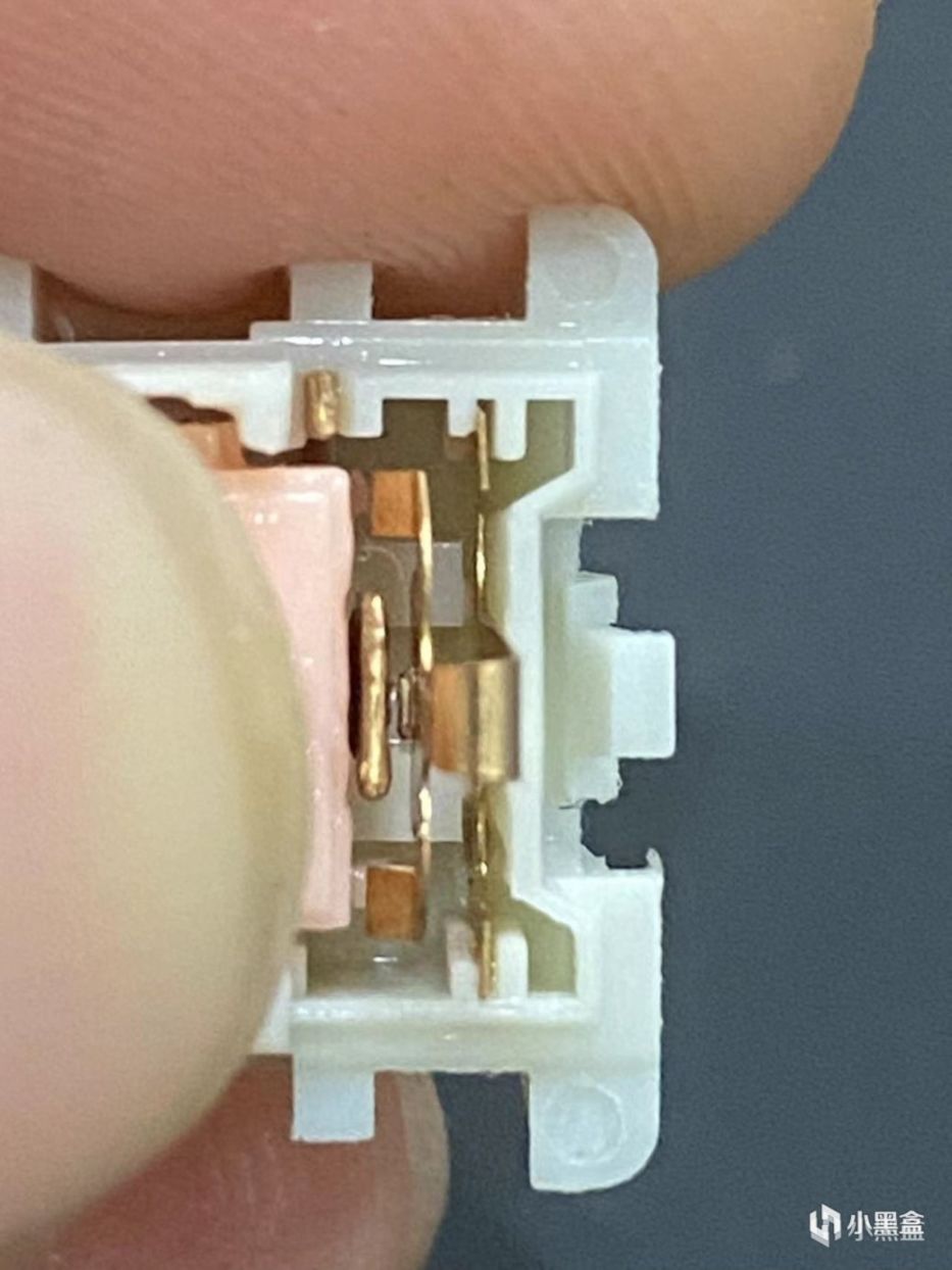 虽然各位看上面两个金属弹片是互相接触的,但是一般的轴芯都会带一个小突起,在轴芯在默认位置的时候会通过这个小突起把两个弹片给分开。