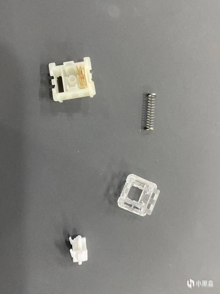 各位现在看到的是一颗拆解开来的康白轴,它分别由底壳,弹簧,上盖,轴芯组成。我们现在重点要说的是底壳和轴芯。