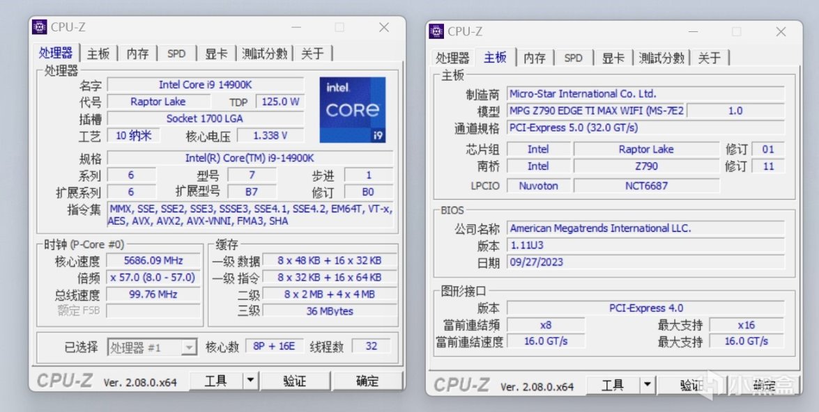 首先运行CPU-Z,我们看到正确识别出了CPU型号,TDP还是125W,频率是5.7GHz。主板是微星的MPG Z790 EDGE TI MAX WIFI。