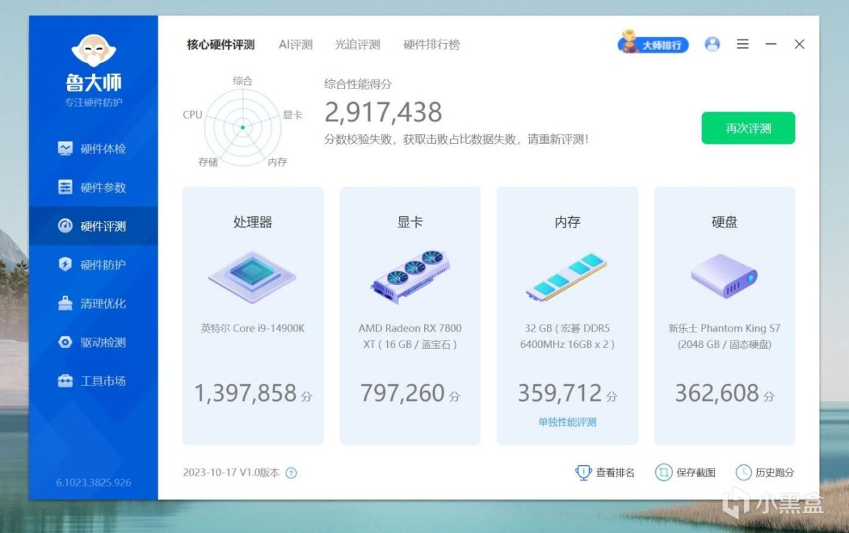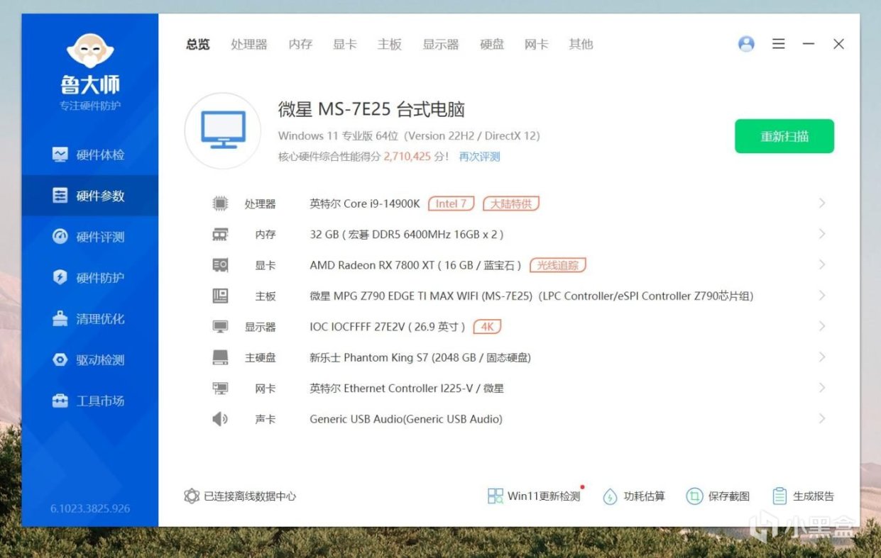 鲁大师,正确识别出了系统配置,CPU处理器是英特尔i9-14900K,内存是宏碁DDR5 6400,显卡是RX 7800XT,主板是微星MPG Z790 EDGE TI MAX WIFI,显示器是27英寸4K显示器,元创师E27。