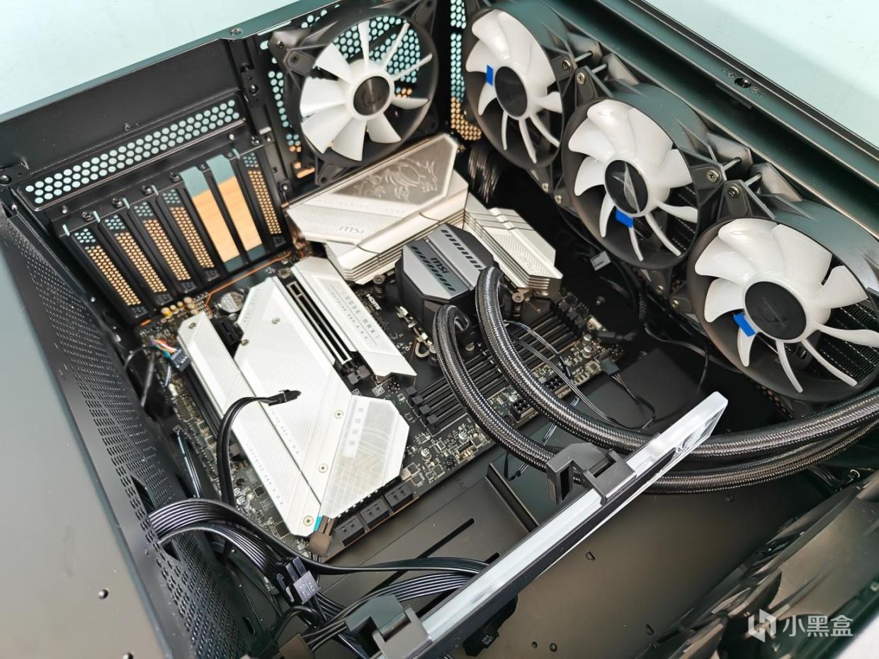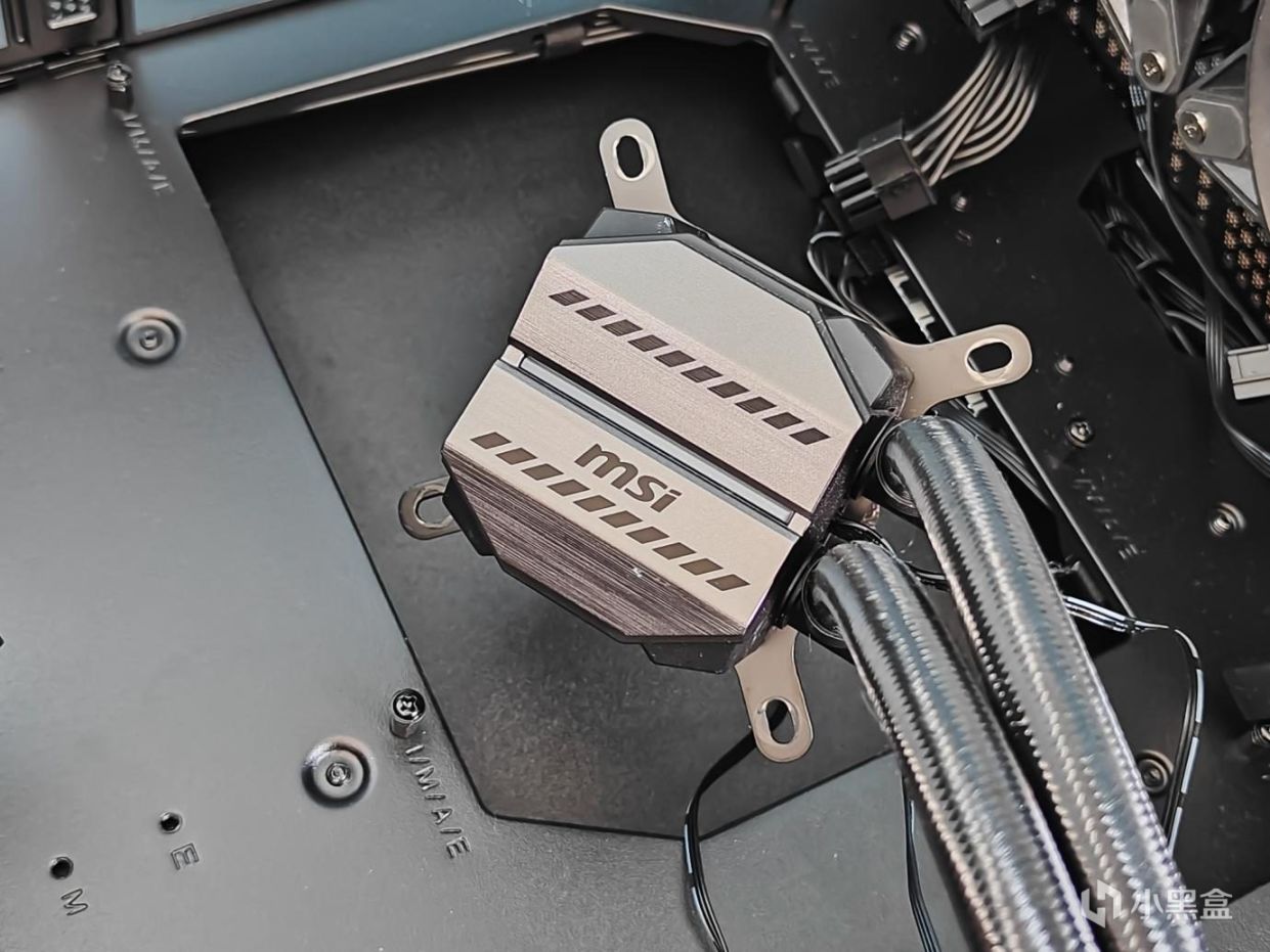 固定好水冷头之后的样子,机箱很宽大,是微星的新款机箱氪金枪300 AIRFLOW。虽然是中塔机箱,但是我们看内部空间还是很宽敞的,安装自如。