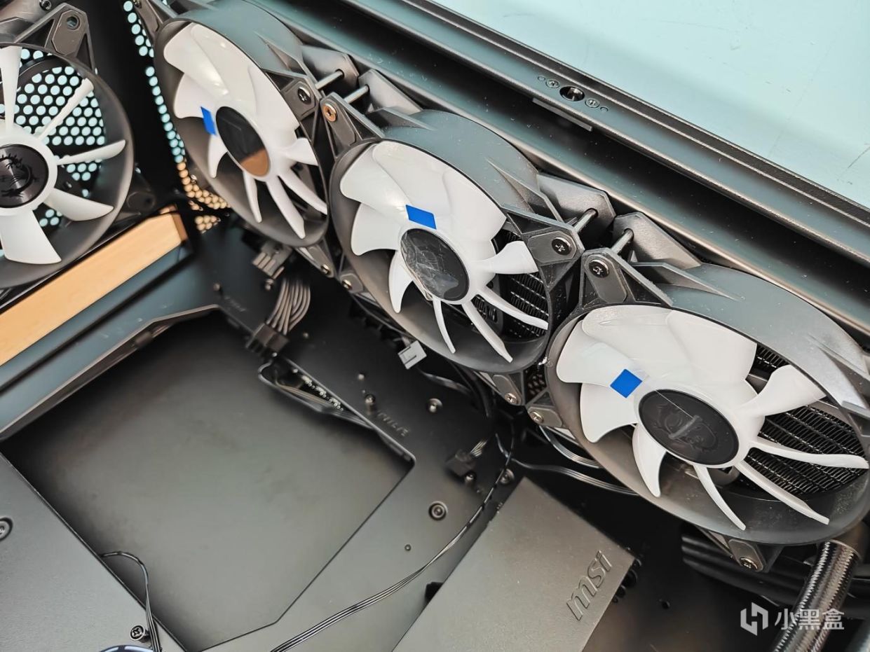 三枚冷排风扇,120mm,支持ARGB,风扇转速600-2200RPM,风速25.5-94.65CFM,气压最大高达3.68mm水柱。丙烯酸材质风扇,可以获得更好的ARGB效果。FDB轴承,有助于降低噪音和减少振动。