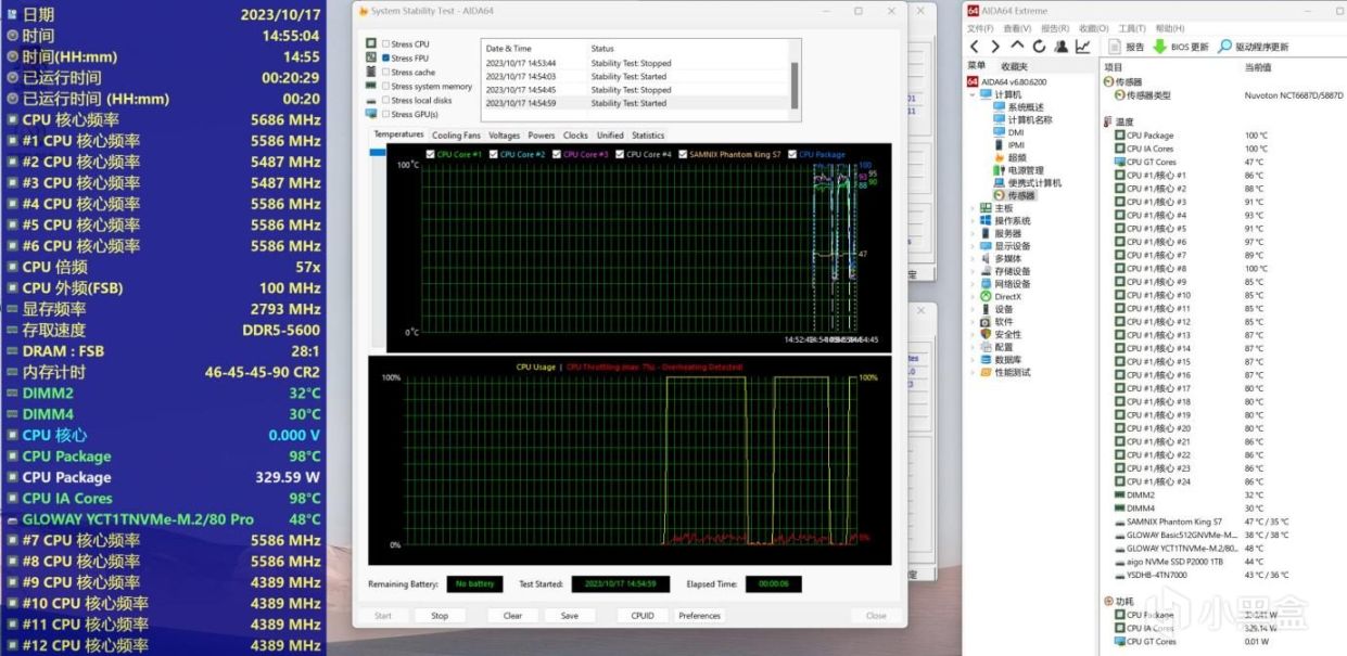 AIDA64 FPU测试,CPU功率330W,碰到了功率墙,有降频现象发生,看来14900K的散热是个需要考验的地方。