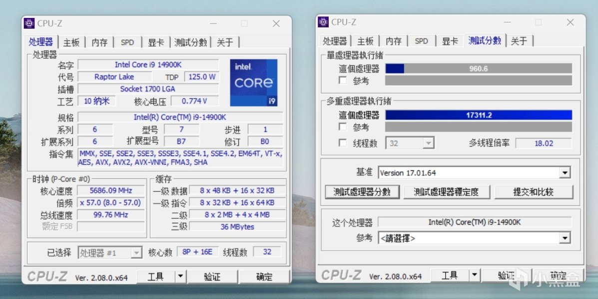最后跑一下CPU-Z,多核17311.2,单核960.6。