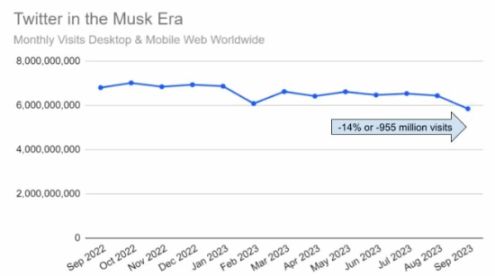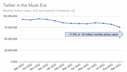 根據市場情報公司Similarweb的數據,X網站的全球流量在9月份同比下降了14%,美國流量下降了19%。在美國的移動設備上,基於iOS和Android的月活躍用戶數也同比下降了 17.8%。