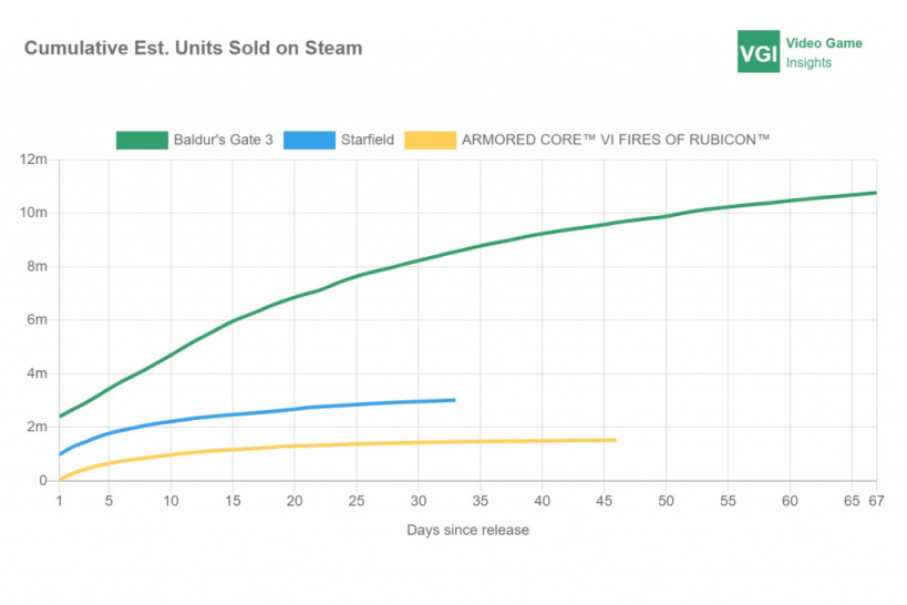 《博德之门3》《星空》和《装甲核心6》是第三季度最热门的三款游戏,但主要收入还是由《博德之门3》带动,因为博德3在前两个月销量就突破了1000万,远远超过其他游戏的所有版本。