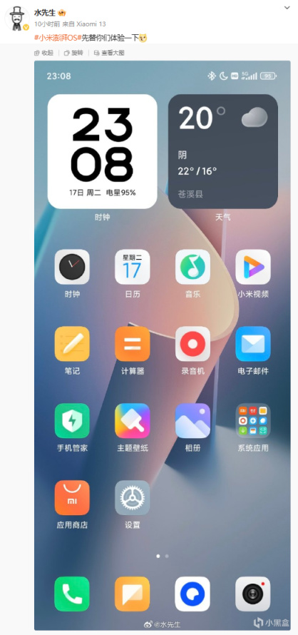 目前已有多方爆料者放出了号称是澎湃 OS 的界面截图,可以看到相比 MIUI 14 有较大变更,包括桌面、控制中心、天气、日历、相机等,锁屏确实可以任意编辑,不过这些截图都没有得到官方证实。
