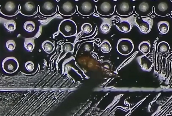 各种常规方法都检测不出原因,最后拿掉AD102 GPU芯片,使用显微镜反复仔细观察,赫然发现竟然有一只小小的虫子,就趴在焊点上。