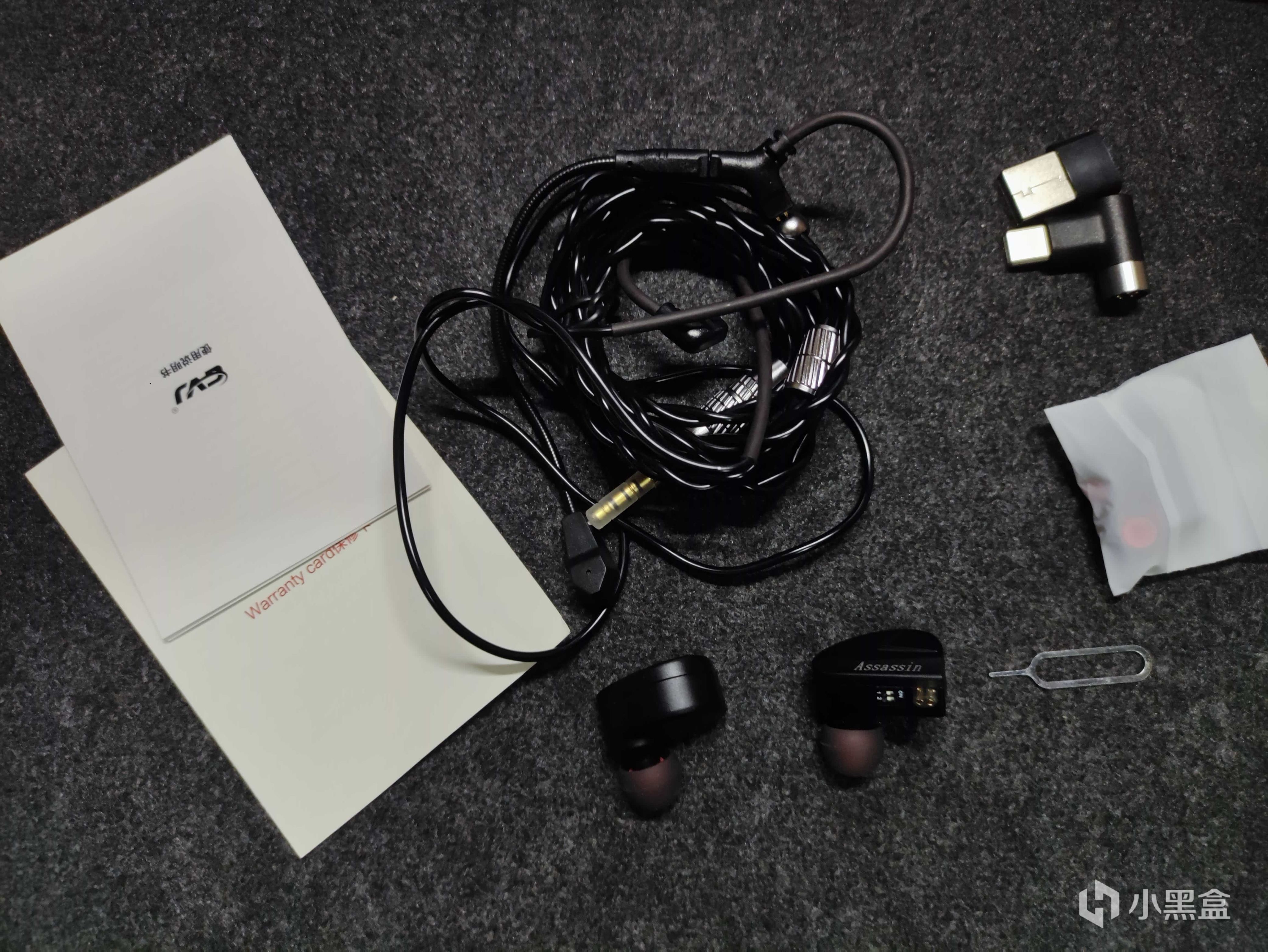 全家福:一对耳机、一根线材、一个插针、一个Type-C转接头、一个USB转接头、一个说明书,一个保修书。