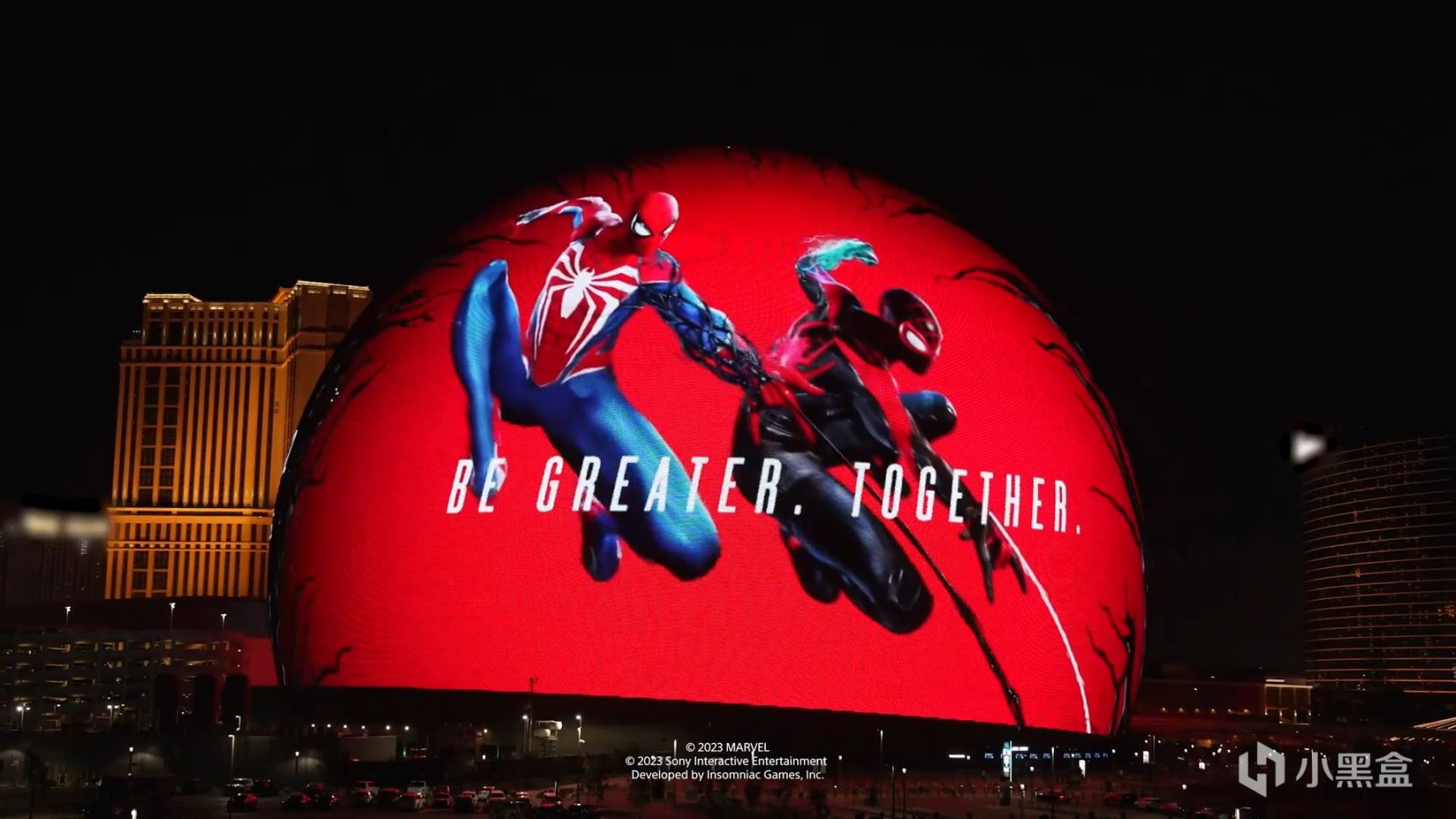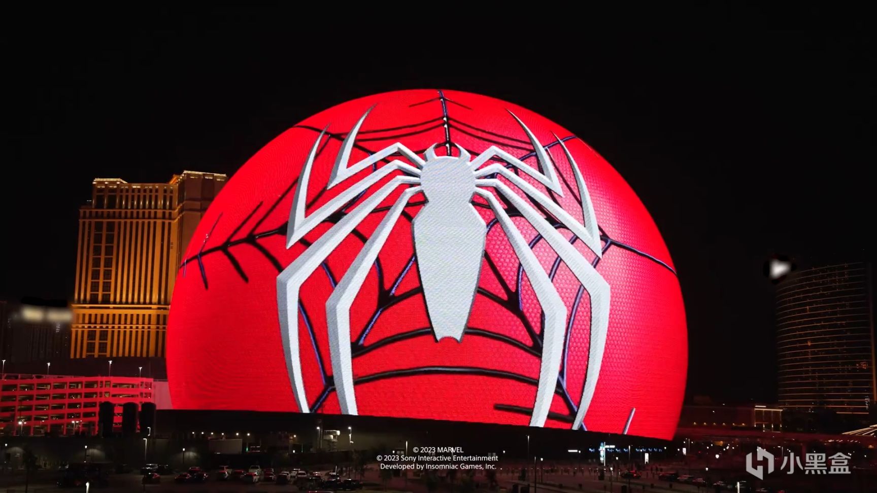 10月20日,索尼也分享了投放在拉斯维加斯巨型球的广告,昨天《漫威蜘蛛侠2》正式在PS5上发售,