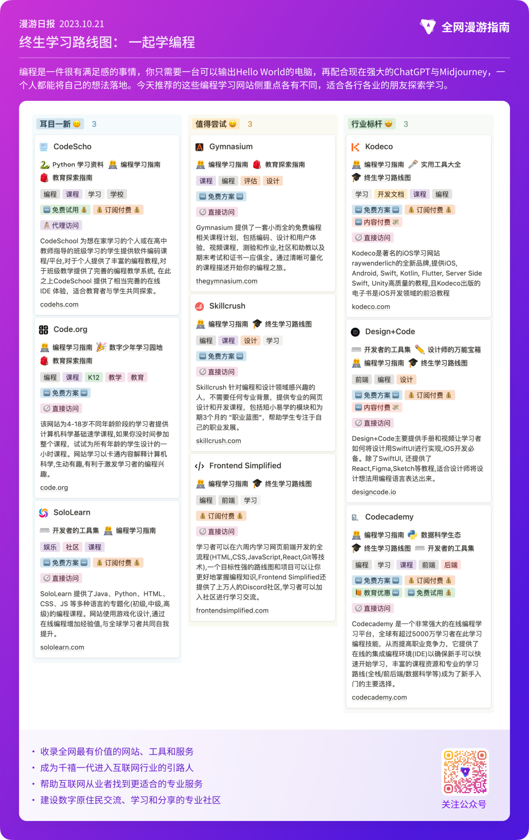 编程是一件很有满足感的事情,你只需要一台可以输出Hello World的电脑,再配合现在强大的ChatGPT与Midjourney,一个人都能将自己的想法落地。今天推荐的这些编程学习网站侧重点各有不同,适合各行各业的朋友探索学习。