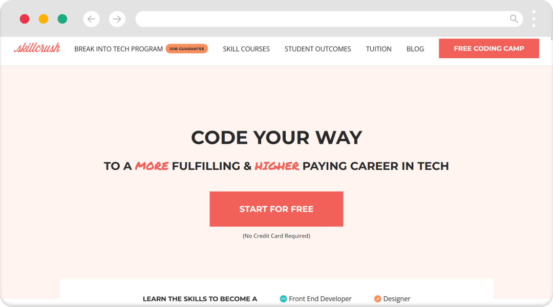 Skillcrush 针对编程和设计领域感兴趣的人,不需要任何专业背景,提供专业的网页设计和开发课程,包括短小易学的模块和为期3个月的 "职业蓝图",帮助学生专注于自己的职业发展。