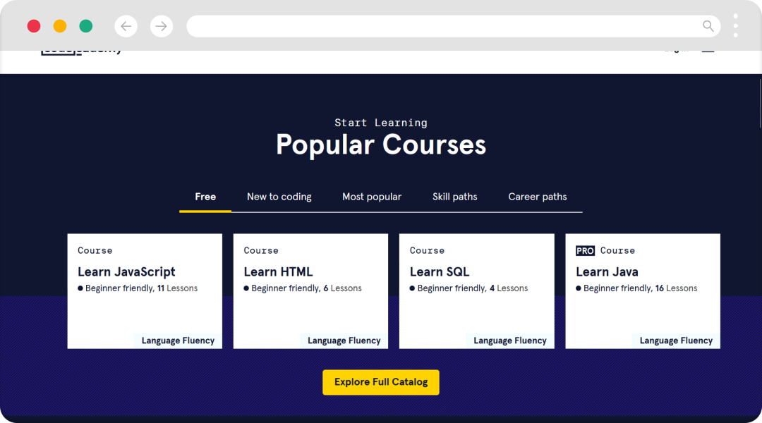 Codecademy 是一个非常强大的在线编程学**台,全球有超过5000万学习者在此学习编程技能,从而提高职业竞争力,它提供了在线的集成编程环境(IDE)以确保新手可以快速开始学习,丰富的课程资源和专业的学习路线(全栈/前后端/数据科学等)成为了新手入门的主要选择。