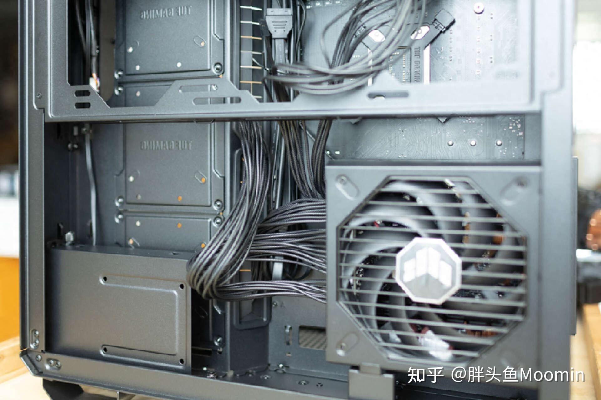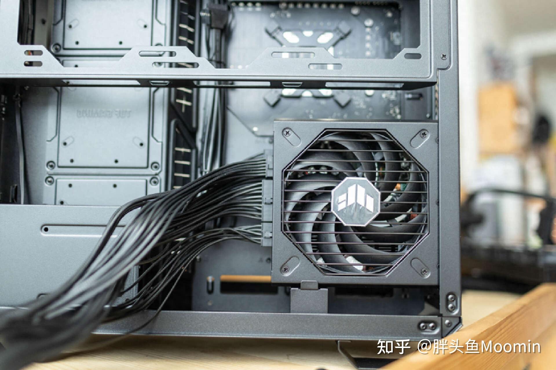 因爲這款機箱支持200mm的長電源,所以安裝這款15cm長度的TUF GAMING 裝彈手850W電源後,走線空間非常充裕。豎置安裝時,風扇需要朝外,配合側面板的散熱柵格可以有效進風散熱保證主機的長時間穩定運行。