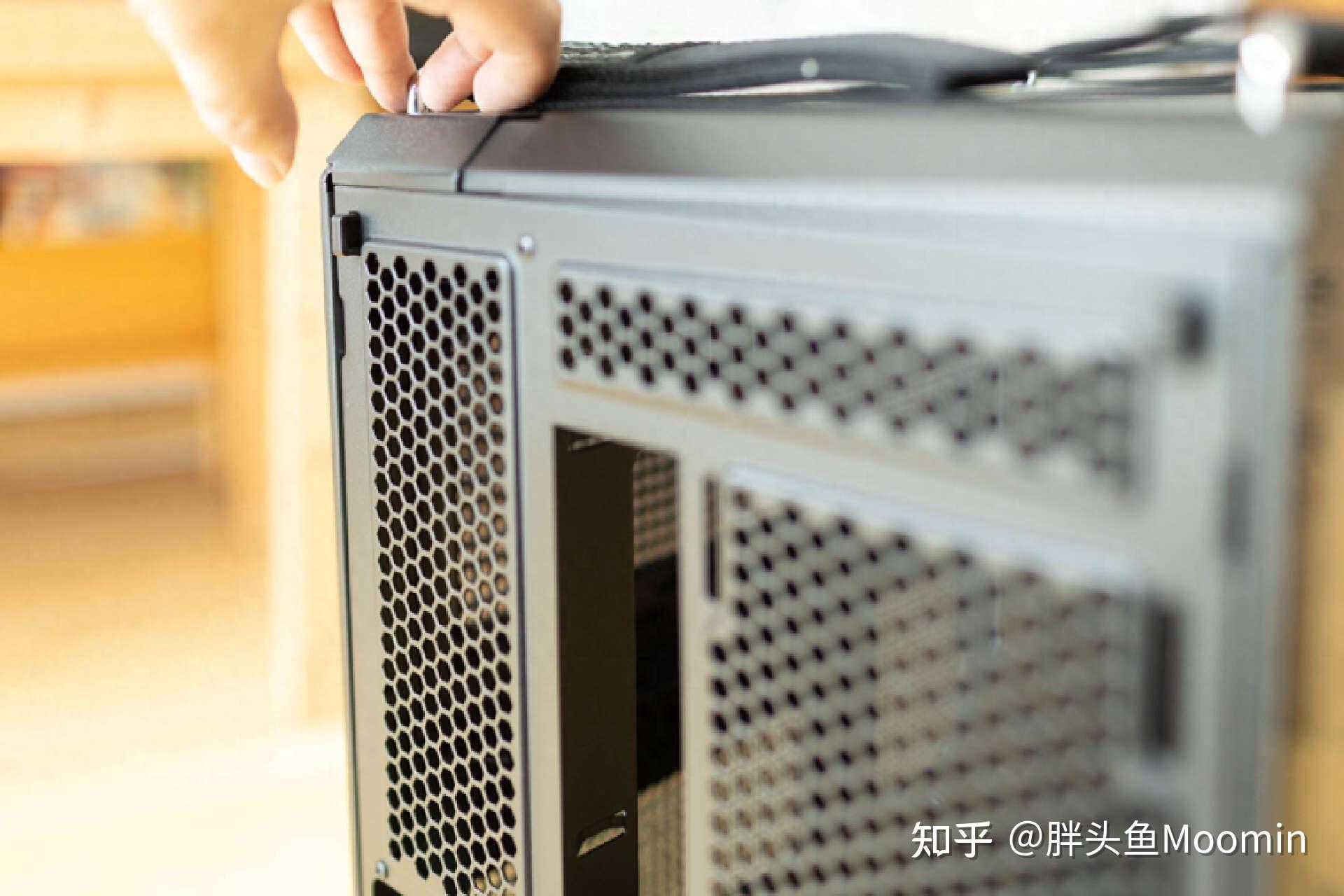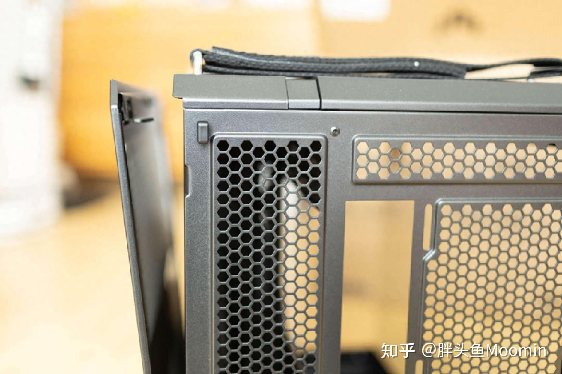 機箱的側面板也採用了免工具拆卸設計,機箱頂部兩側各有一個物理解鎖鍵,按壓就能輕鬆拆卸側面板,特別是對於海景房這種經常會更換擺件佈局的機箱來說,真的很人性化。