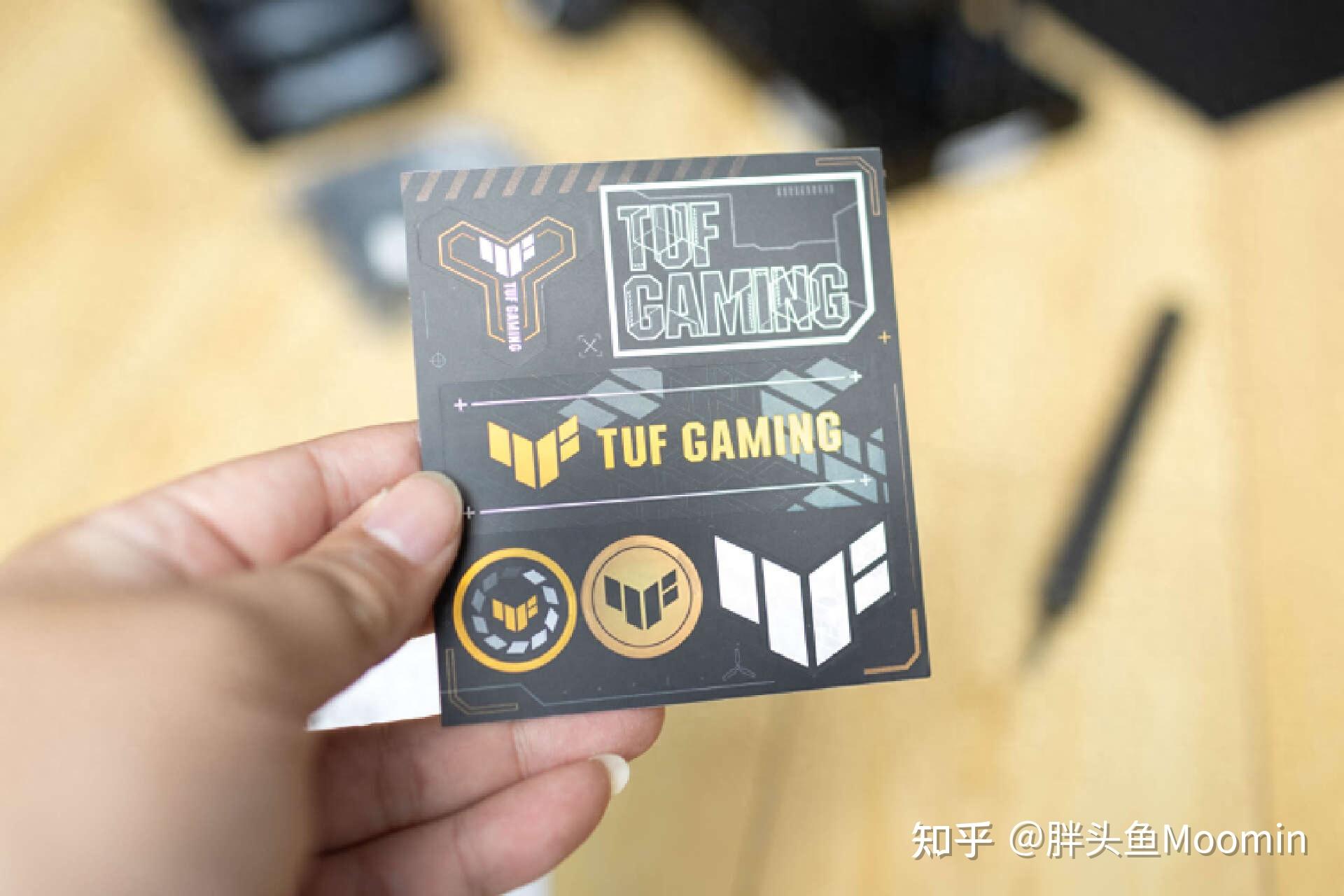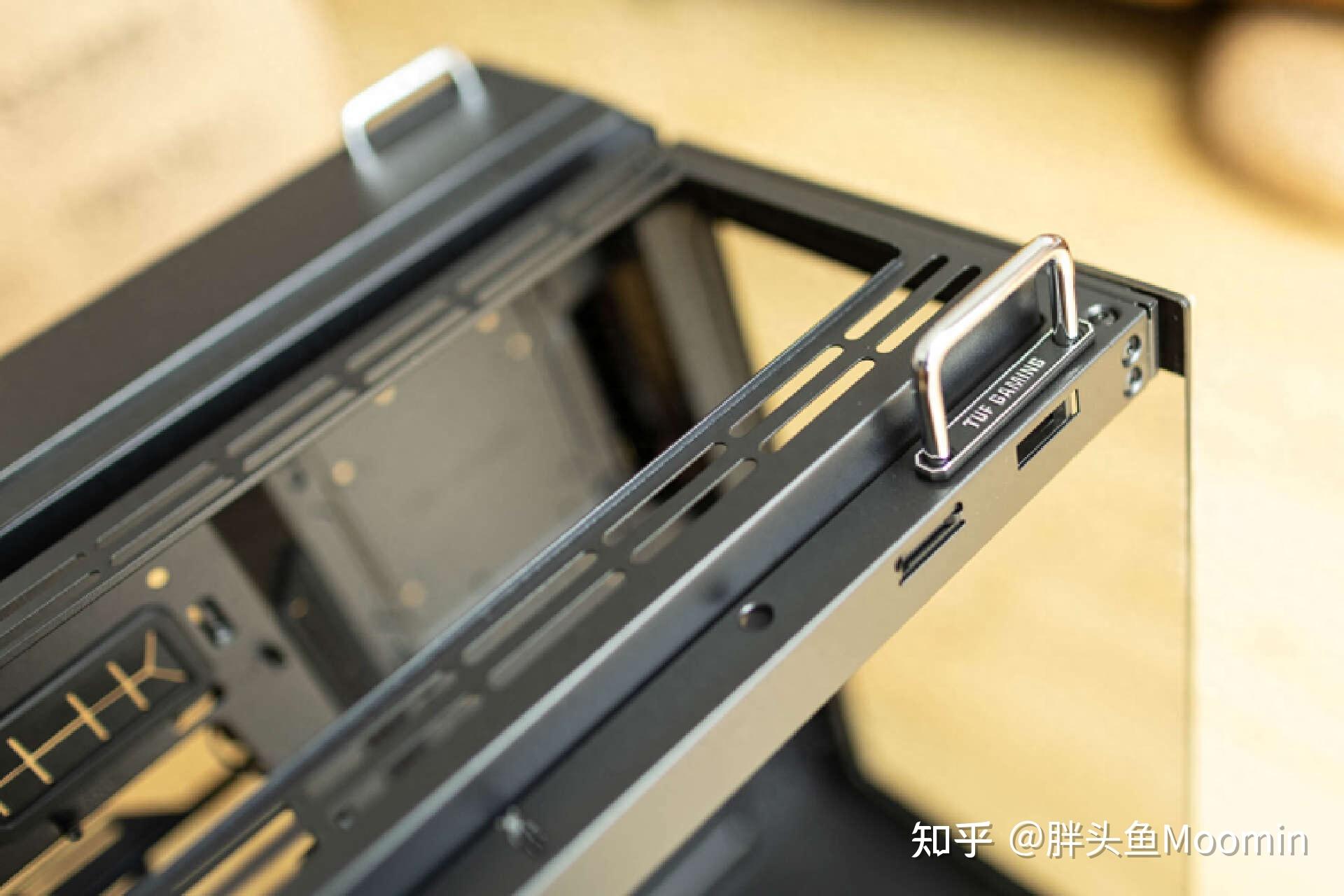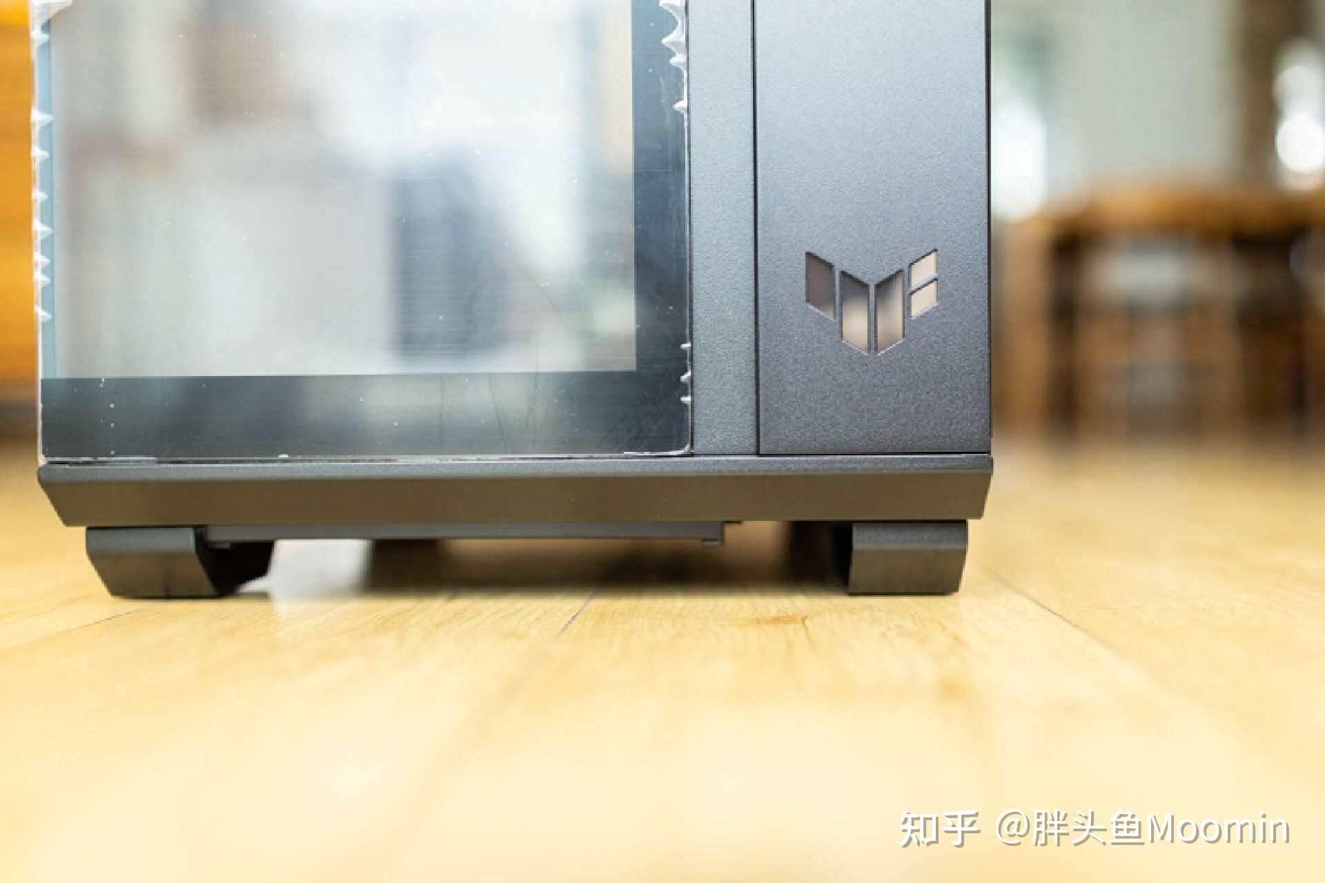 機箱底部採用的是懸浮式的全金屬腳架,支撐穩定並且很好的平衡了機箱的厚重感。靠近機箱底部位置,可以看到TUF的金屬銘牌,不僅是立體工藝,還帶有明顯的金屬質感和反光,識別度直接拉滿。