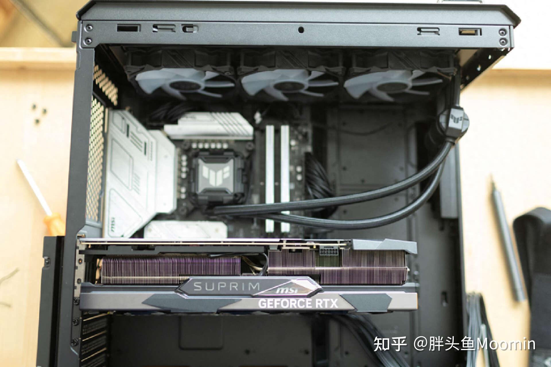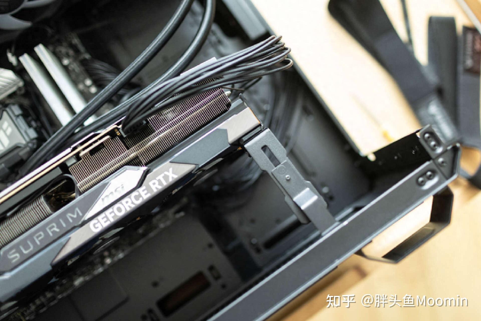 顯卡方面,這款機箱兼容長達400mm的超長顯卡。我這裏使用的就是顯卡中的巨無霸,微星的4080超龍,可以看到顯卡安裝後,底部還有一大塊的剩餘空間。