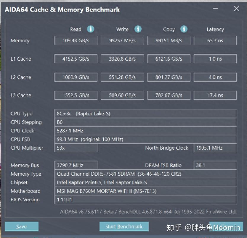 內存方面,我這組金百達白刃內存開啓默認XMP後,可以穩定運行在7600MHz@CL36-36-46-120 CR2,實測讀寫速度爲109.43GB/s,95257MB/s,延遲65.7ns,表現已經相當不俗。