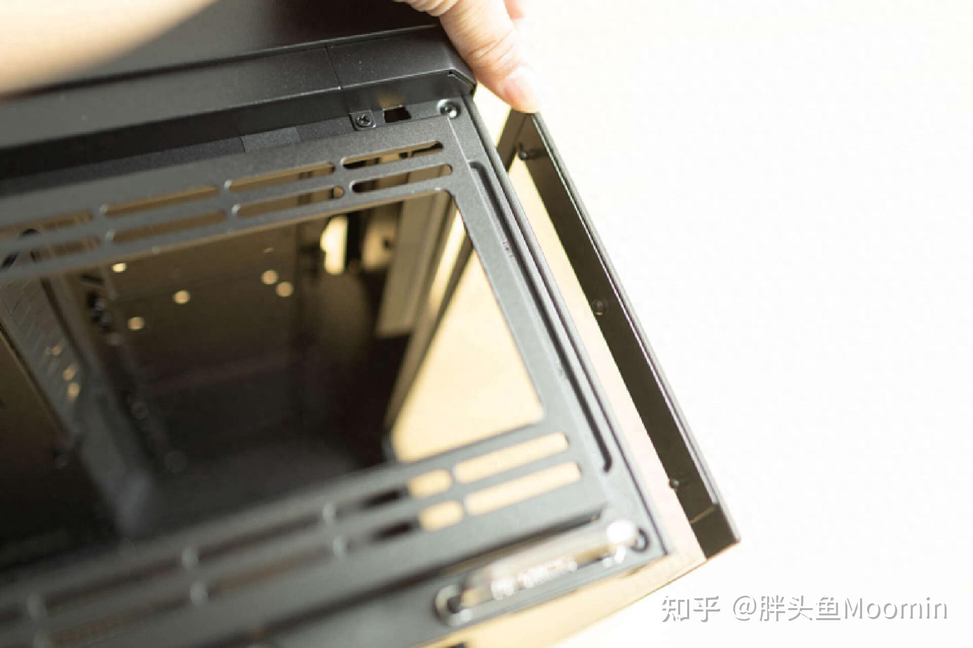 另外,這次海景房的前面板同樣支持快拆,在機箱頂部內側能看到一個卯榫接口,輕推中間的卡榫就能輕鬆取下面板。