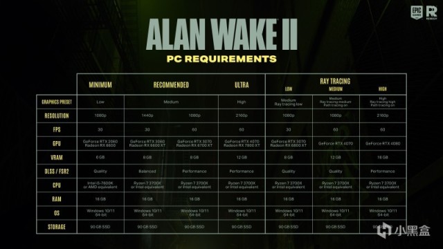 从配置表上看,《心灵杀手2》配置要求最低为RTX2060,不开启光追的前提下,想要1080P跑60FPS,至少也要RTX3070或RX 6700XT显卡。而对于高档区画质表现,仅推荐了RTX4070和4080。另外硬盘空间方面,《心灵杀手2》游戏将占用90GB的容量,需要放入SSD固态盘中。从以上要求上看,该作针对中高档PC端用户,另外PC端目前仅在EPIC平台上线。游戏将于今年10月27日正式上线,登陆PS5、XSX和PC平台