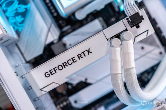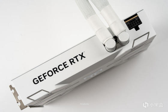 简约造型的显卡肩部只标注了GEFORCE RTX,右边则是进出水口和12VHPWR接口,水管采用高分子聚合水冷软管,外部编织防护管包网,这个可调式冷头节支持旋转设计便于安装,不过旋转的时候需要注意两个接头互碰的情况
