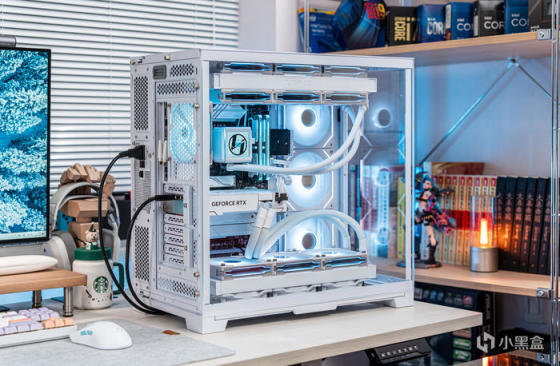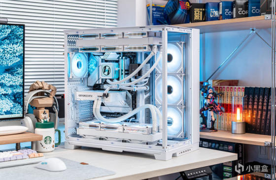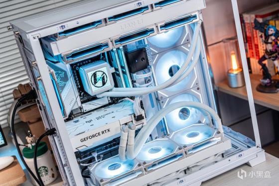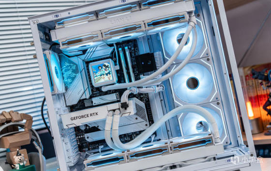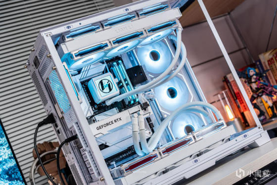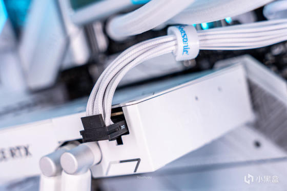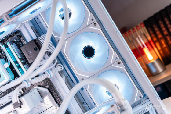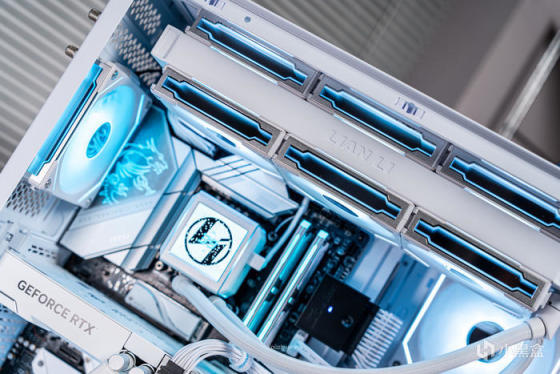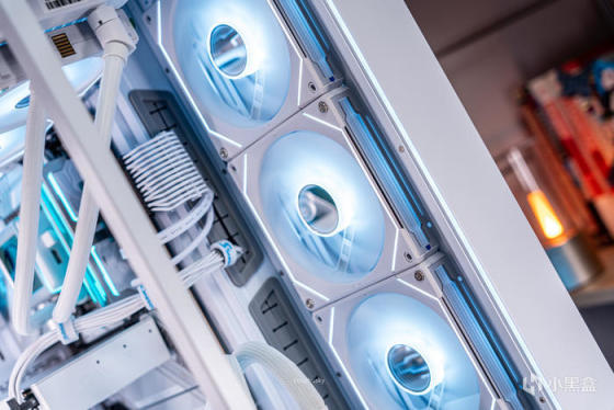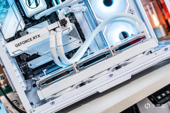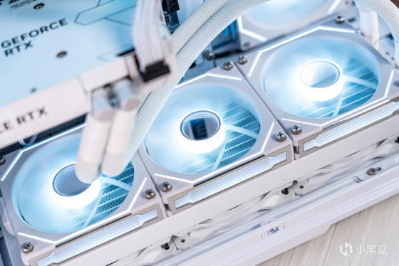 水管采用高分子聚合水冷软管和编织包网,连接了显卡本体和纯白360冷排,底部为显卡自带风扇,上面3个为联力三代积木反叶风扇