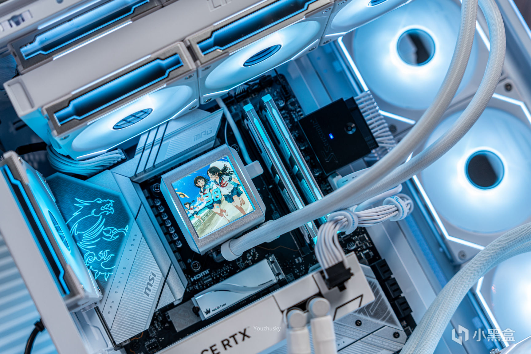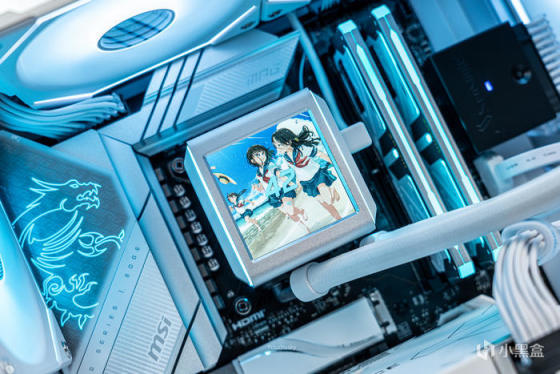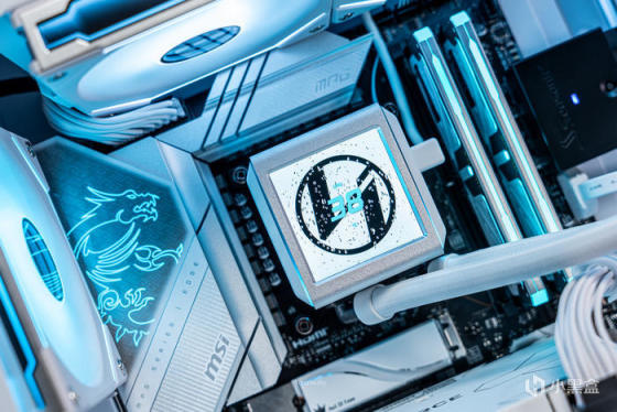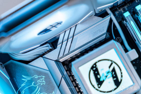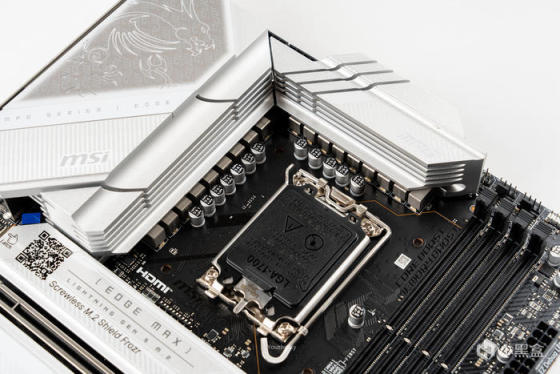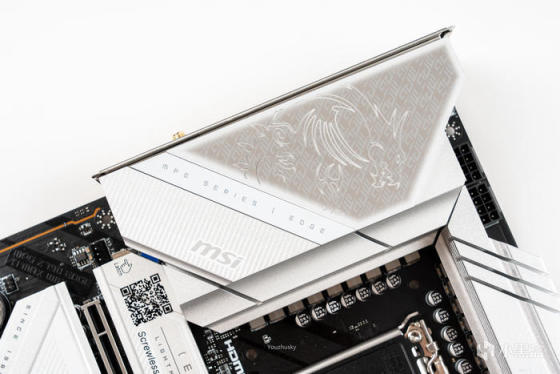 白色主题使用了微星的MPG Z790 EDGE TI MAX WIFI主板,龙盾徽标下为16+1+1的强悍供电与第三代钛金电感