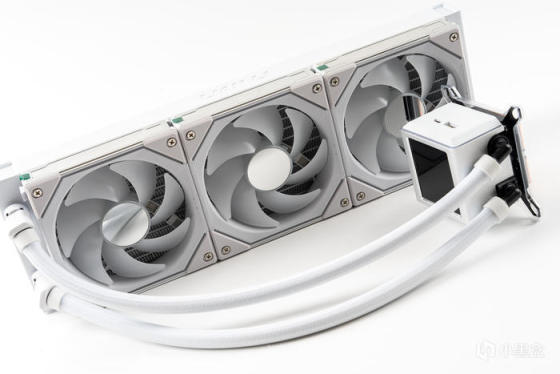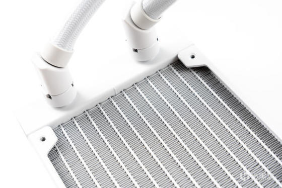 散热器经过专门设计采用45°旋转接头,可方便安装与走线调整方向,而冷排使用了30mm厚度散热器且搭配了20FPI的单波散热鳍片设计,气流限制较少散热效率毕竟高