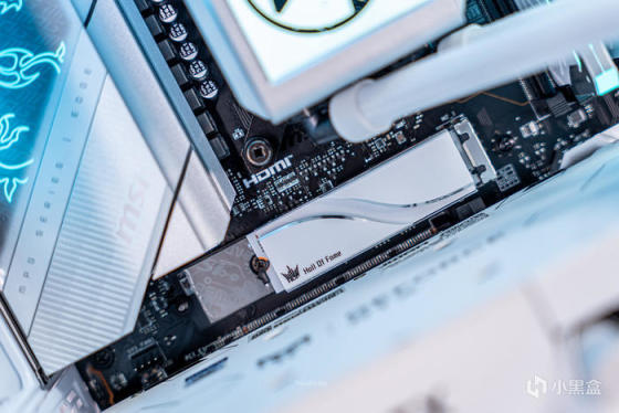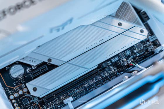 主板第一条M.2上的影驰HOF EXTREME30 PCIE4.0 1TB ,它采用了全铝CNC曲面工艺纯白定制的曲镜白泳散热器,使用的是3D NAND颗粒和8通道群联PS5018-E18主控
