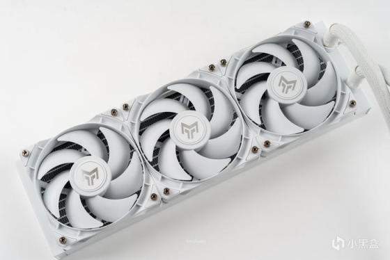 纯白AIO 360冷排的本体,3个风扇通过串联线缆从水管包网内延伸至显卡供电;风扇是惠州讯硕MARTECH 的DF12025B2MN,12V 0.37A,标准的12025规格高风量高风压的冷排扇,2250RPM,最大噪音37dBA;冷排本体标准厚度,12条加厚型微水道和S型散热片设计,可有效增加接触面积以利于热交换