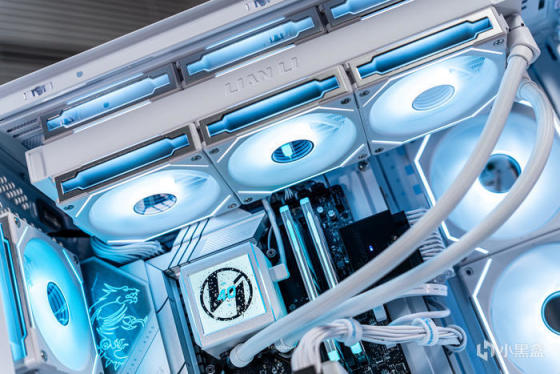 包豪斯EVO XL 大号海景房怎么能少得了联力自家的积木风扇,而三代积木风扇以及两代V2中灯效最好看的当属SL-INFINITY 幻境的三代积木风扇了,不仅扇框和扇叶都支持ARGB光效,且中心无限镜ARGB和铝质框架环绕无限镜ARGB的加持都让它的灯效拉满,而且三代积木本身的风扇属性也都一点也不弱已然成为了灯光爱好者的首选。这里主要使用了如下一些风扇:4090金属大师AIO OC显卡本体风扇和3把幻境120夹汉堡从底部进风,顶部的极圈二代360幻境120夹汉堡出风,而侧边冷排架的3把140幻境和尾部1把120幻境都为出风设计。