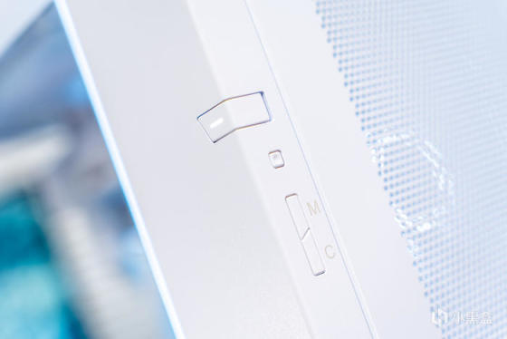 位于前面板中间的前置按钮区,双面可按下的开机键同时还带有ARGB电源灯,中间为一个小颗粒重启键,下面两个一体的为灯光模式按钮和灯管颜色按钮