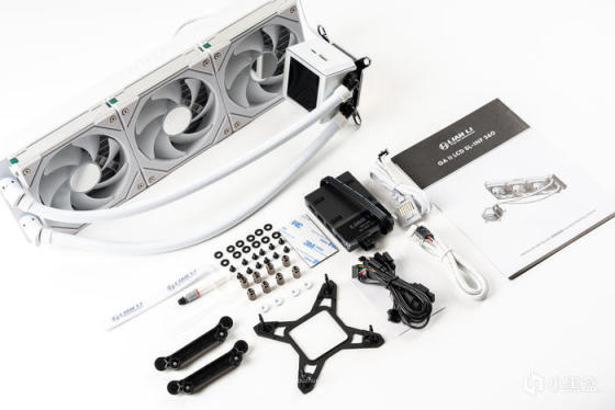 极圈二代LCD 幻境360的全家福,除了水冷本体和幻境积木风扇和扣具外,还有L-Connect控制器;配件产品包括魔术扎带、AMD扣具和intel扣具,L-Connect控制器和控制器线缆,硅脂、冷头连接USB线缆和风扇线缆,最后是产品安装说明书