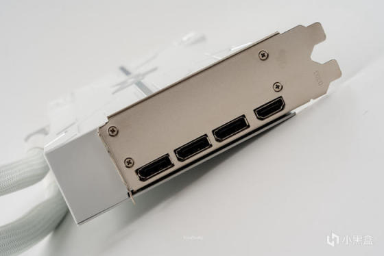 显卡的挡板也是封闭式的,毕竟水冷显卡散热都只需要通过冷排带走热量就可以了,接口则是40系标准的3个DP1.4A+1个HDMI2.1