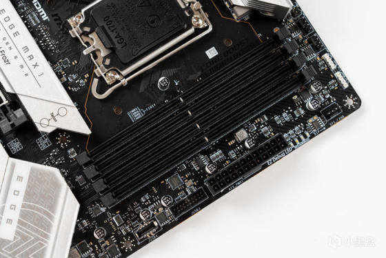 主板顶部右侧的散热模组一点也不小,而且与左侧的扩展型散热片通过热管相连,也足以应付将来的14代CPU甚至14900KS等