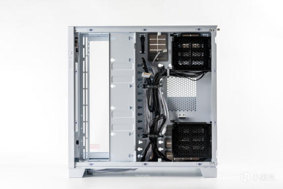 默认形态下的侧板区域,4mm的全透钢化玻璃内部一览无遗,主板托板默认是居中式,上下皆有不错的冷排兼容性