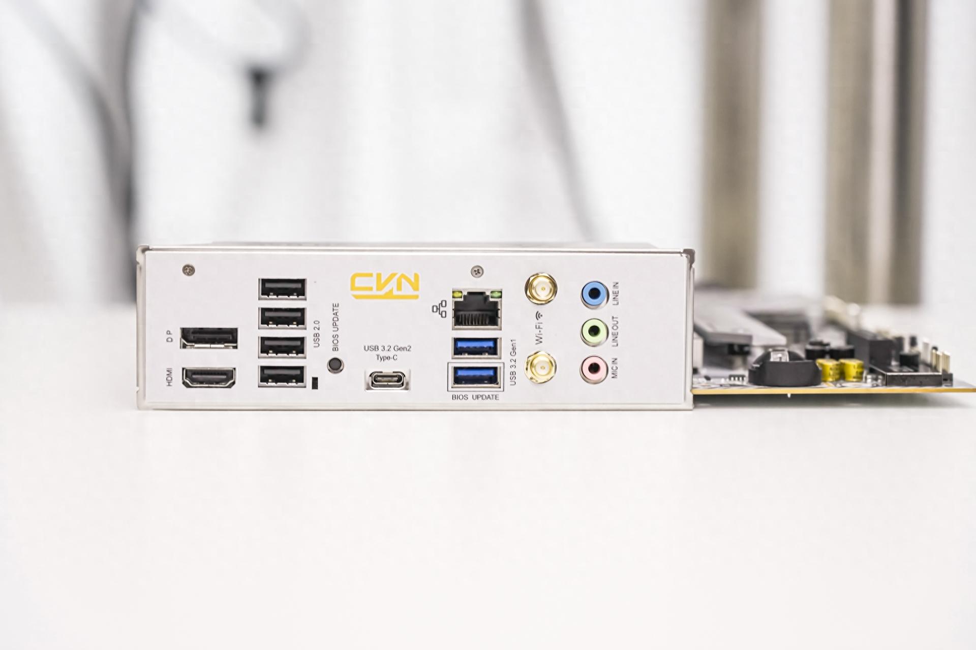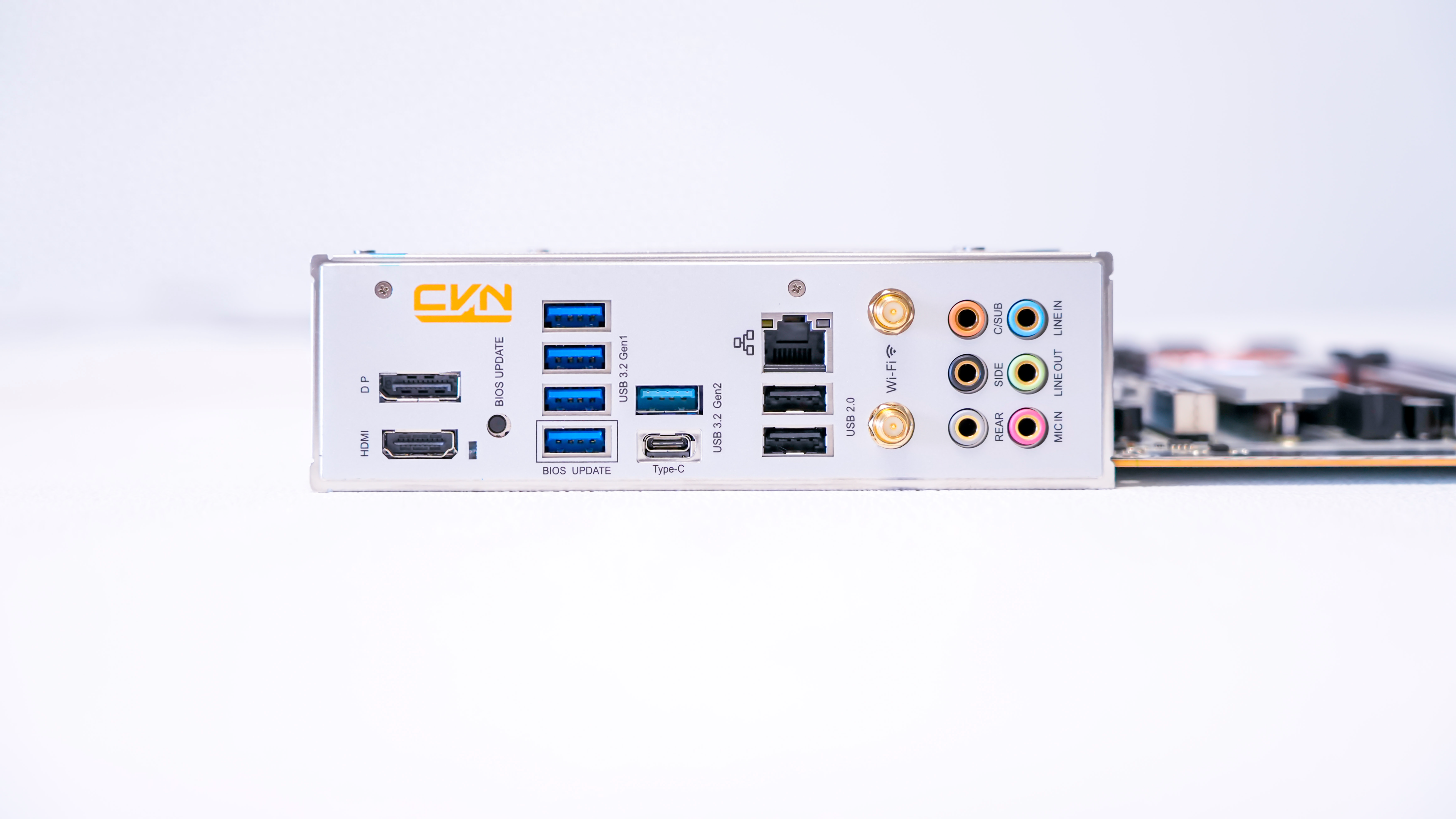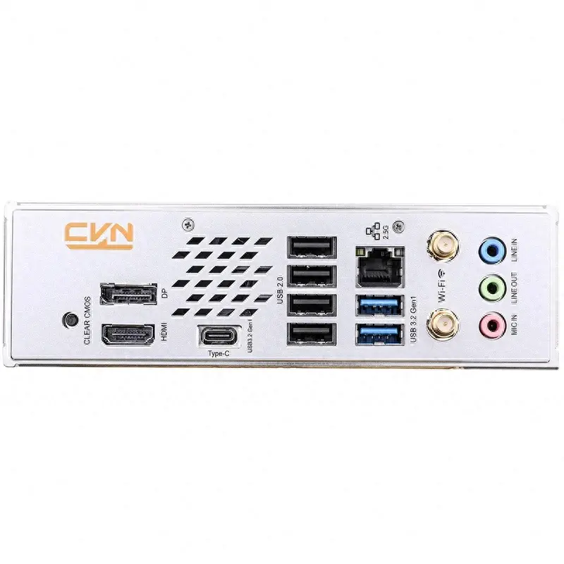 七彩虹CVN B760M战列舰尾部的 I/O 区域采用的一体式挡板,包含 HDMIX1,DPX1,USB2.0X4,USB3.2Gen2 Typ pe-A X 2,2.5G网络接口,WiFi6天线接口,3个音频接口,以及 BIOS更新按钮,可以通过 USB 设备 一 键更新 BIOS。