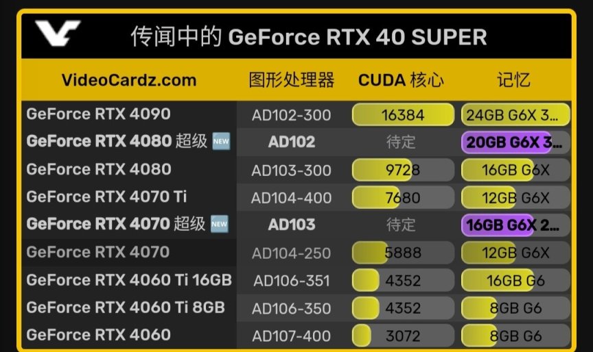 而最进,有部分舅舅党表示会有三款新显卡的到来,而外媒为我们带来了GeForce RTX 40 SUPER 系列的新爆料。