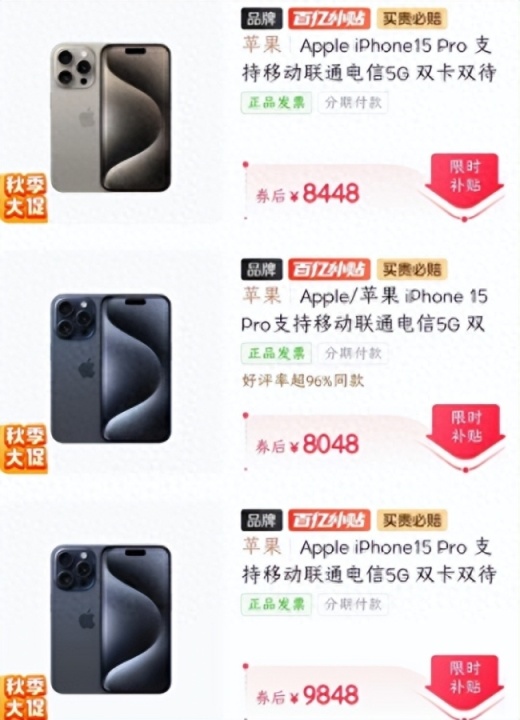 眼下,在某电商平台上,128GB版本的iPhone 15仅售5198元,256GB版本更是低至6098元,而官方价格分别是5999元和6999元;而iPhone 15 Plus的128GB版本则以6148元的超低价出售,而256GB版本则低至7048元,官方价格对应的则为6999元和7999元;至于备受期待的iPhone 15 Pro,其128GB版本为7498元,而256GB版本则仅需支付8048元,而官方价格分别为7999元和8999元。最后,iPhone 15 Pro Max的256GB版本以9098元的诱人价格惊艳登场,而512GB和1TB版本分别售价为10798元和13398元。而官方价格相继为9999元、11999元和13999元。可见,双十一前夕的iPhone 15系列机型几乎所有存储版本都不复存在昂贵的溢价,即便是备受追捧的iPhone 15 Pro和iPhone 15 Pro Max,价格也大幅降低了近千元的幅度。