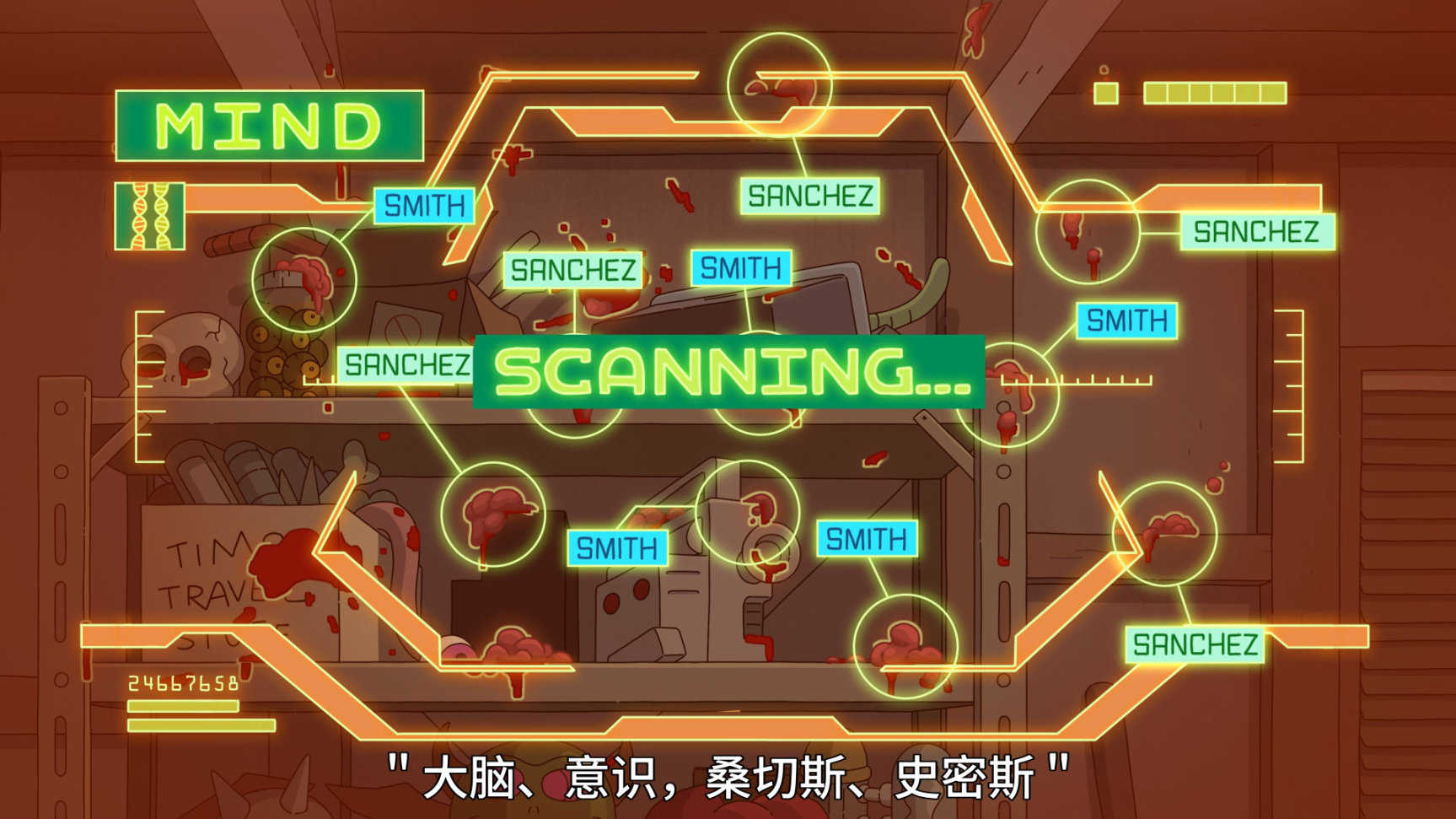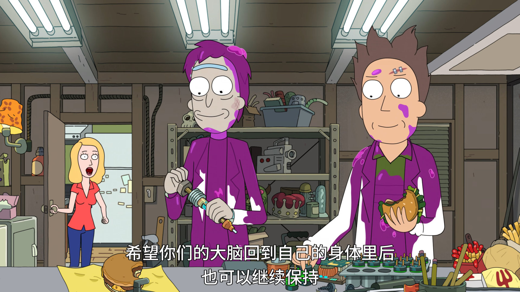 兩人互換後,傑瑞(瑞克)直接發狂舉槍自殺,瑞克(傑瑞)因爲不適應姥爺的科技身體,弄得頭破血流.第二集一開頭直接讓兩人死了一遍,好在車庫裏的AI把兩人治療復活了,AI在治療兩人的過程時,大腦和意識等沒有準確的還原,導致兩人的思維意識仍然混亂.(兩人的身體中各有一半對方的意識這樣?)