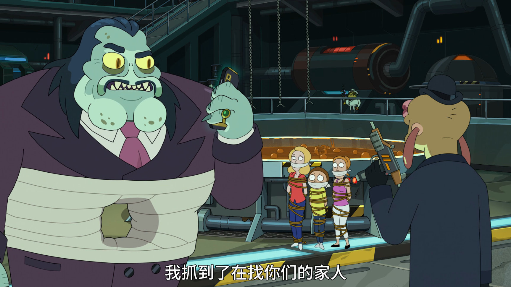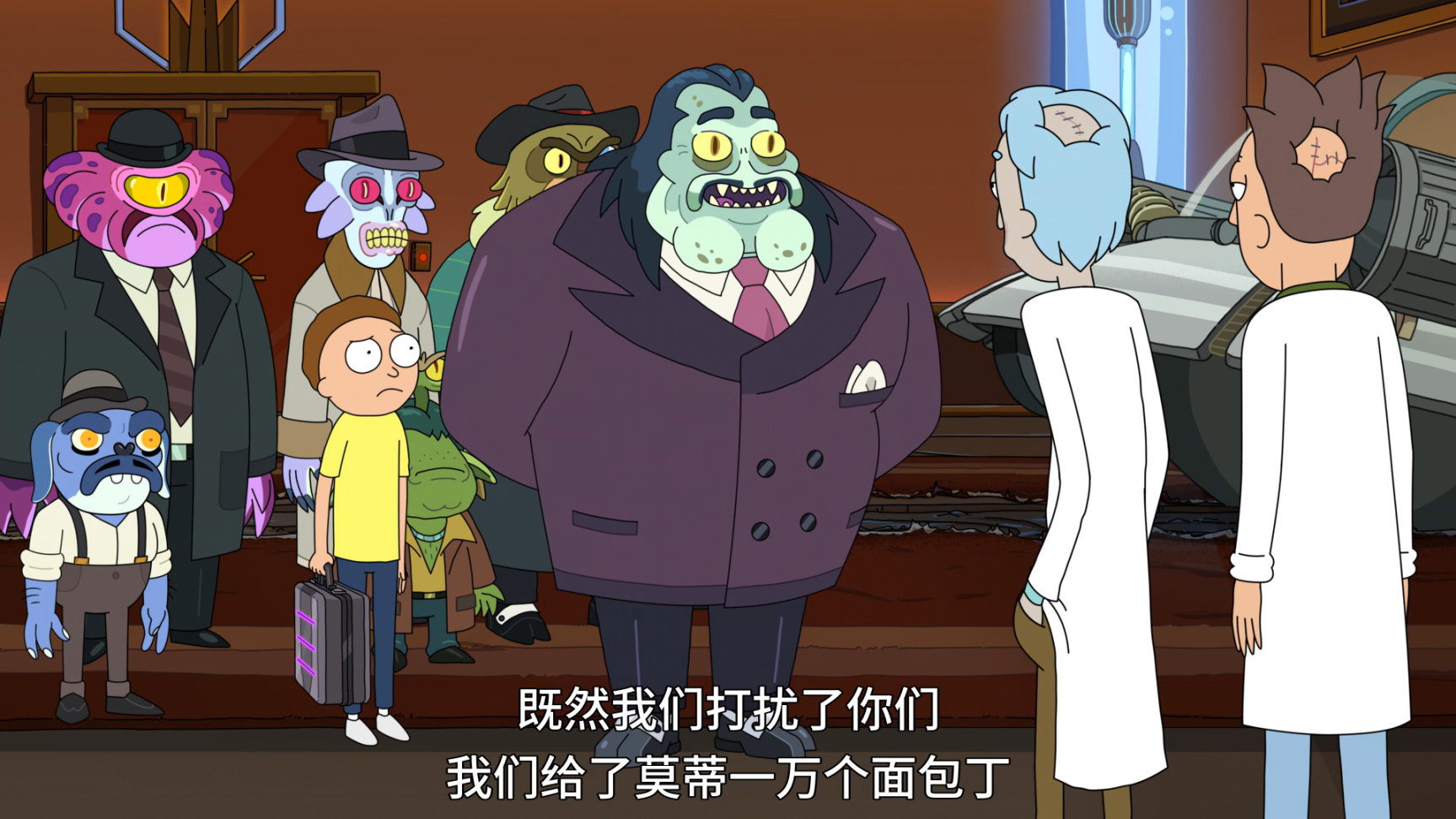在兩人爭吵時,罪惡城的一個黑幫老大打來電話,叫瑞克把莫蒂接回去.(莫蒂在黑幫底盤販賣水晶時被黑幫老大的手下抓了,黑幫老大當然認識姥爺,也知道姥爺的厲害,於是趕緊把莫蒂好喫好喝的伺候着)