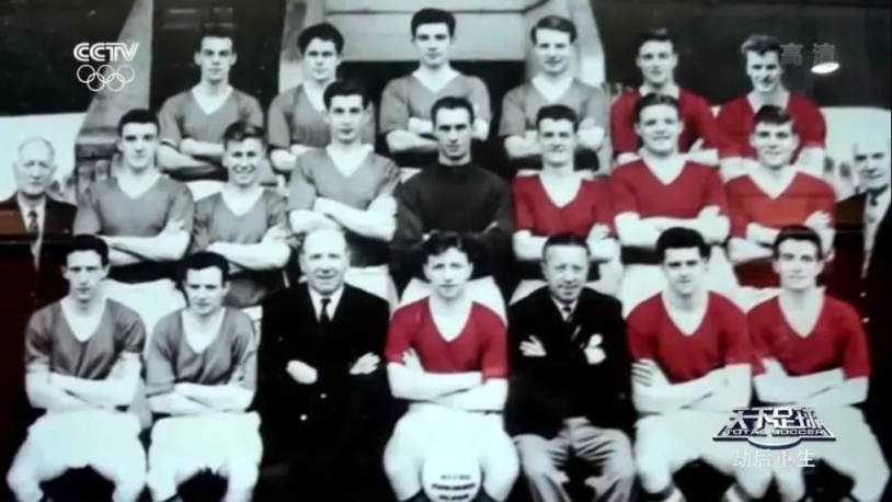 巴斯比和他的孩子們的合影,八名在慕尼黑空難中遇難球員的球衣被標成紅色
