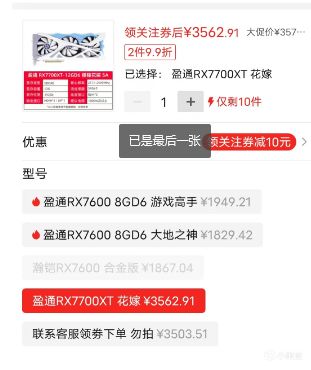 RX 7700XT 品牌:某宝/盈通/花嫁 现售价:3560元 历史最低价:3299元(某宝/盈通/花嫁)