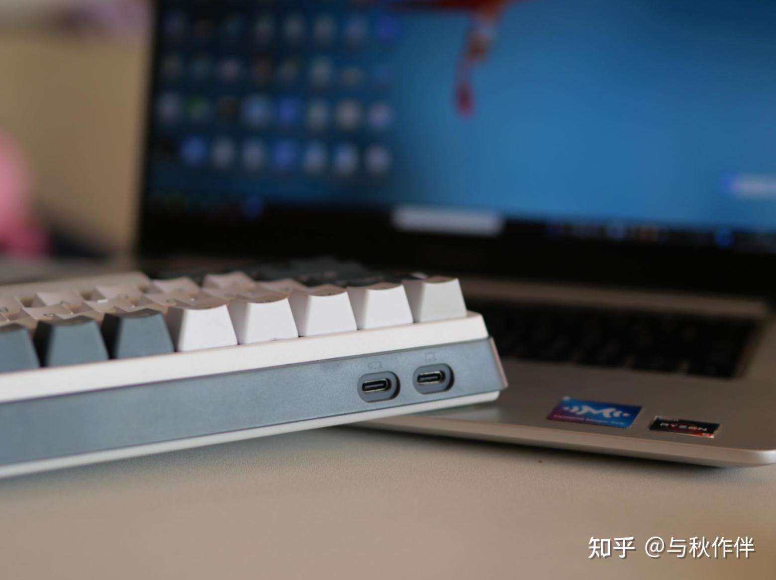 这把键盘支持2.4G和蓝牙,日常用蓝牙可以节省一个U口,接有线的时候,前面还有一个额外的C口可以用,正好可以插U盘。右侧旋钮切换蓝牙设备很方便,我平时把设备1设成笔记本,设备2设成小米平板,设备3设成手机。比起其他键盘使用组合键切换蓝牙设备,这把键盘的这种切换感觉更加直观舒适。